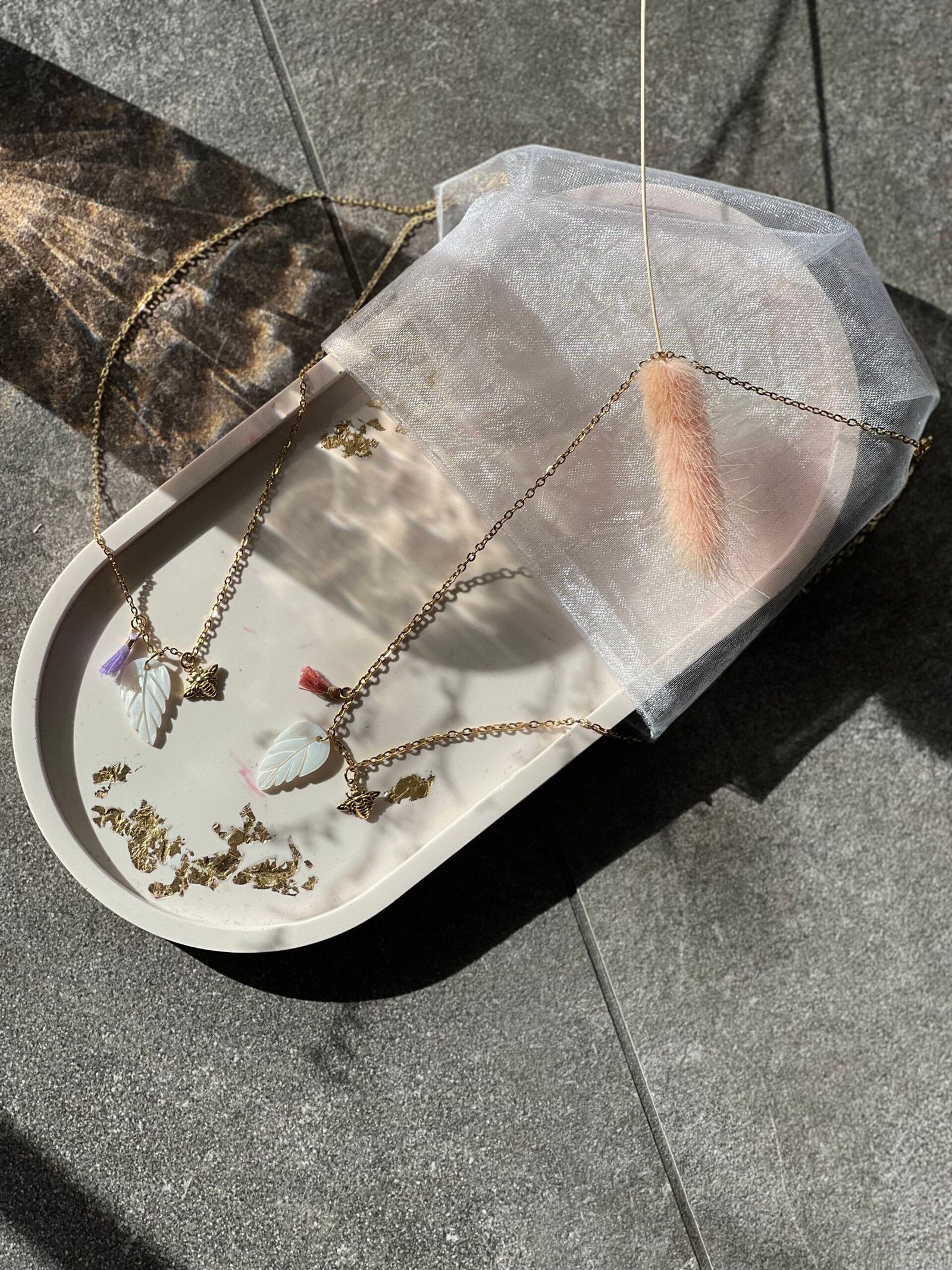 Collier avec chaine en acier inoxydable doré, plume en coquillage et pendentif abeille en acier inoxydable. Ce collier peut être porté autant par un adulte que par un enfant. La couleur du pompon peut être personnalisable selon votre envie.